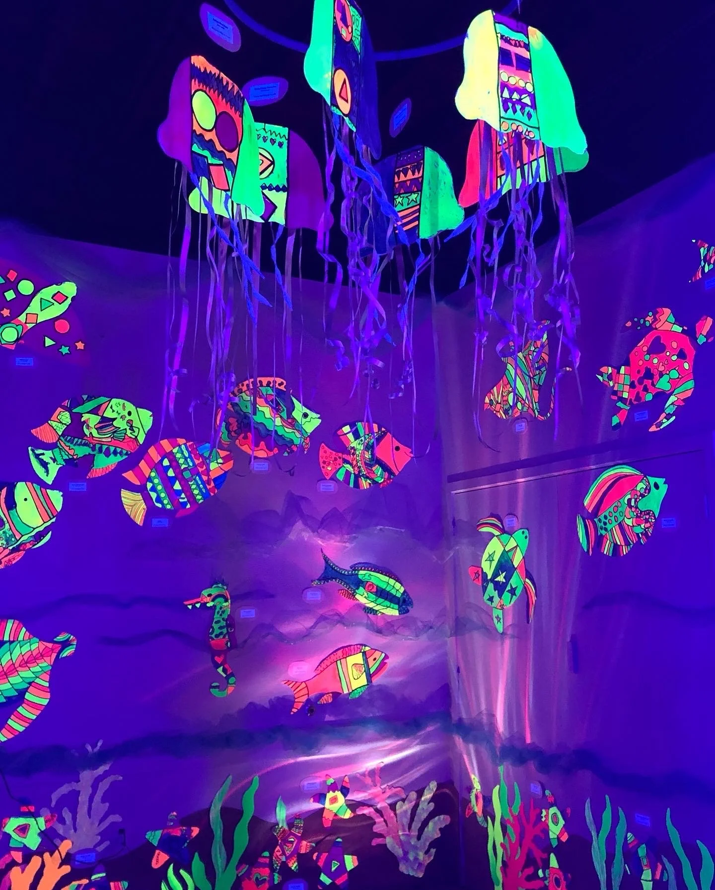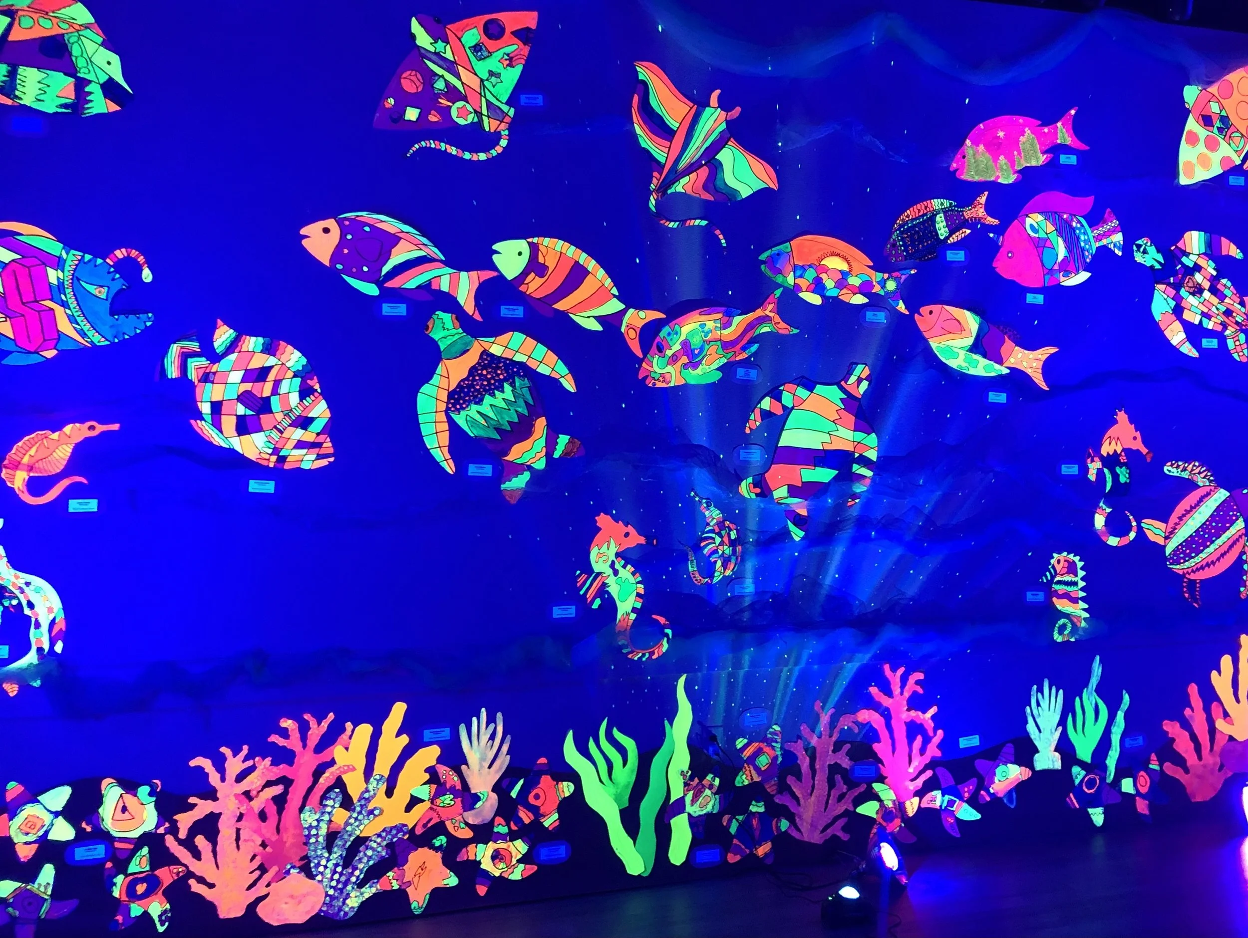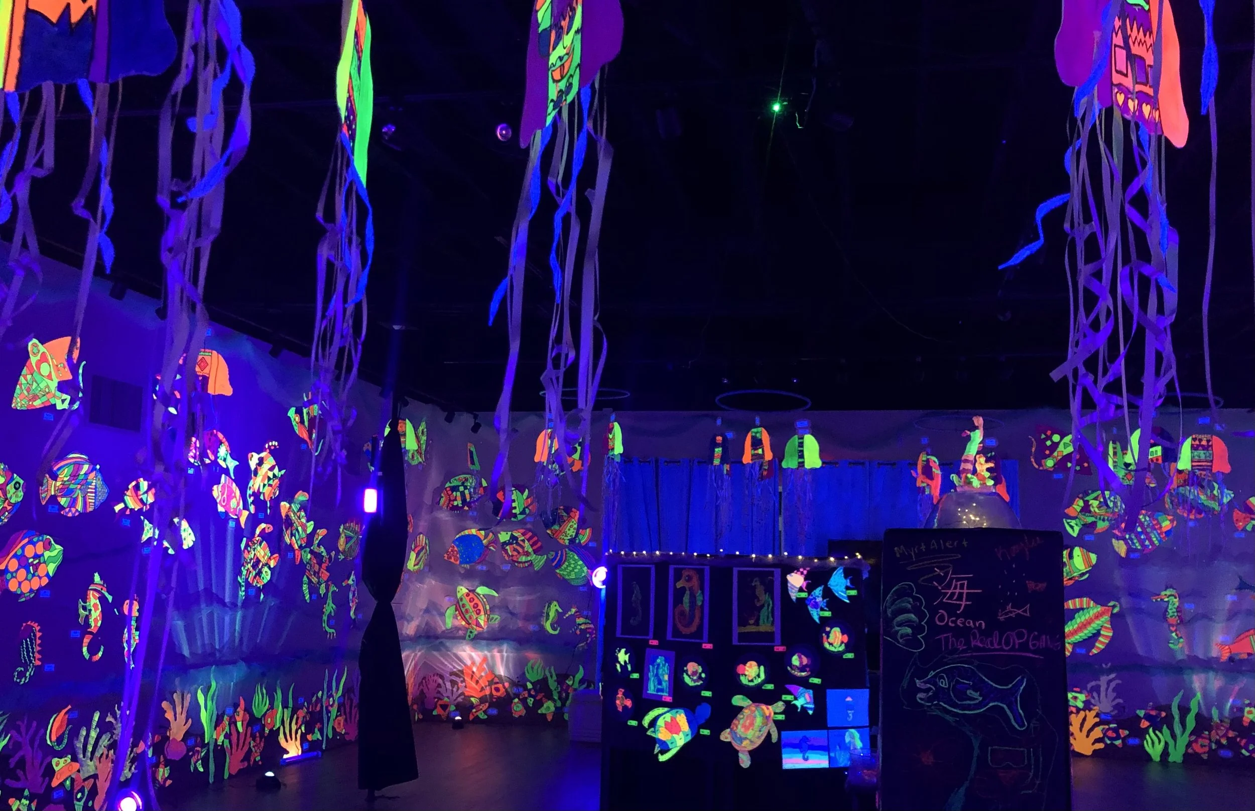 Two hundred children at Maxey Arts Magnet Elementary designed and painted neon sea creatures for a black-light community exhibit in Winter Garden. Visitors to this immersive experience were visually transported to an underwater world filled with fish, sea turtles, jellyfish, stingrays, and starfish. Children who created the art were invited to a special reception for their family and friends at SoBo Gallery in Winter Garden, Florida. Maxey Arts Magnet Elementary is a Title 1 school. Nearly all Maxey Elementary students are minority and low income.